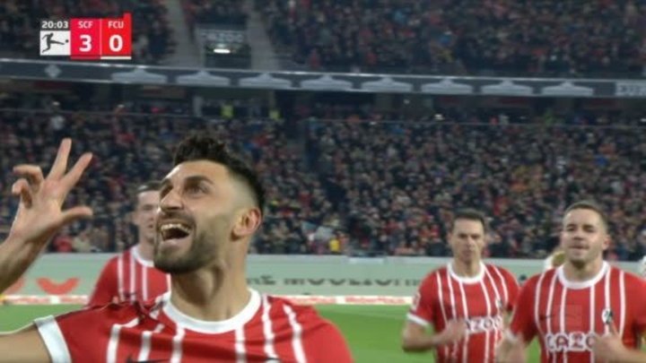 Der SC Freiburg gegen Union Berlin. Vincenzo Grifo erzielt einen Hattrick außerdem spielt Union 70 Minuten lang in Unterzahl.